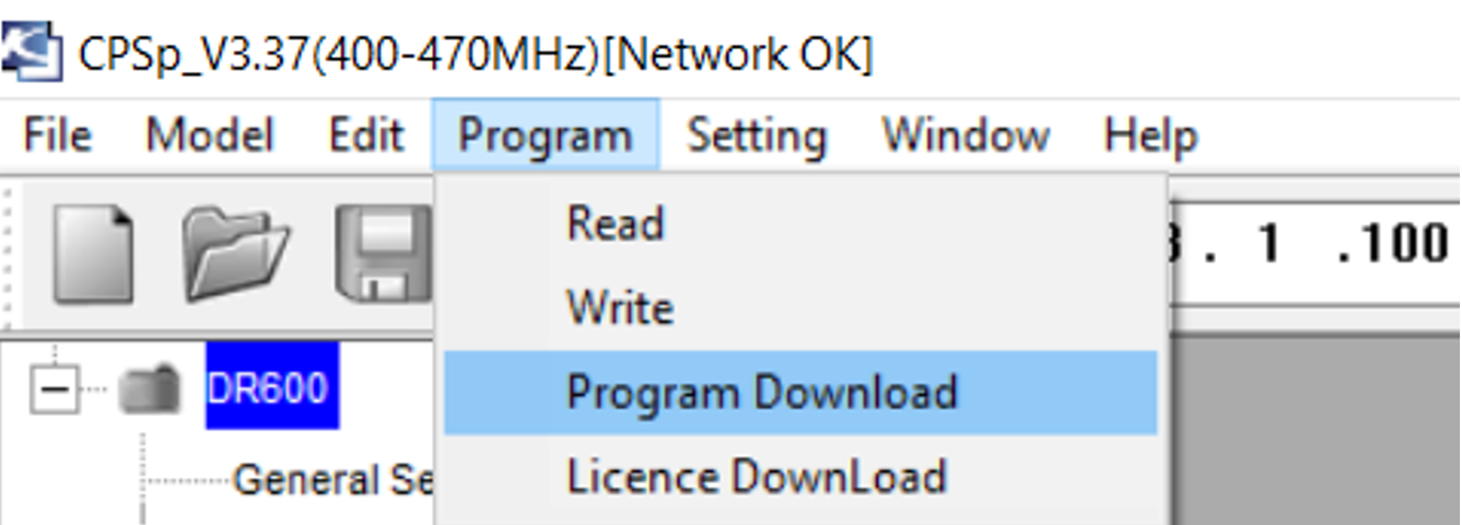 Подключаемся к ретранслятору, считываем параметры и переходим в Program-> Program Download