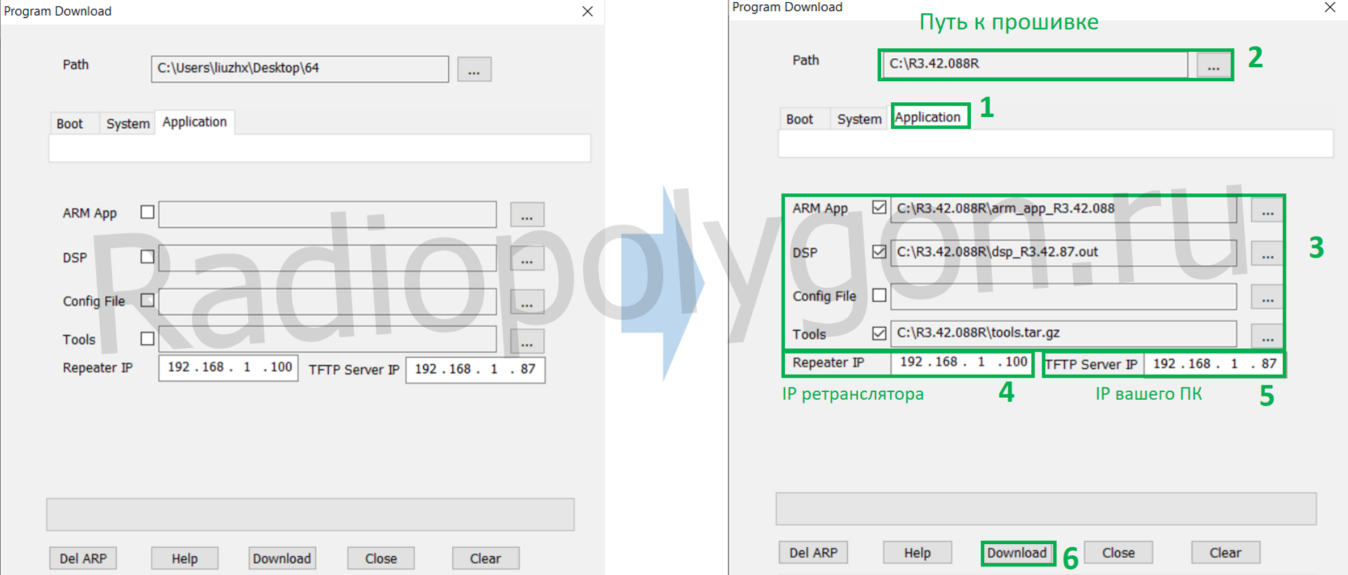 Откроется заводской шаблон. Сразу переходим на Application (1) и указываем путь к папке с прошивкой в строке Path (2). Путь к основным 3 файлам прошивки (3) должен прописаться автоматически. Бывает так, что вам надо загрузить только один компонент из прошивки, тогда путь к этому компоненту можно выбрать отдельно. Далее вносим IP-адрес ретранслятора Repeater IP (4) и IP-адрес с вашего ПК, который выступает tftp-сервером TFTP Server IP (6)