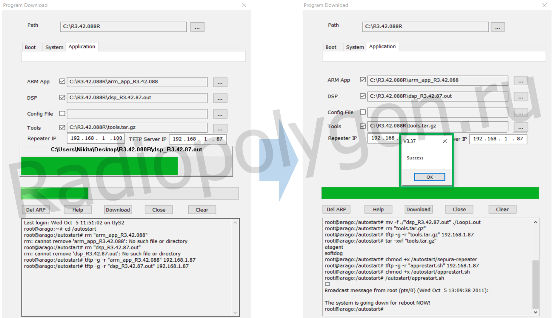 Дальше ждем жмем Download (6) и наблюдаем процесс загрузки прошивки до появления уведомления Success (Успешно). После чего ретранслятор перейдёт в ребут.