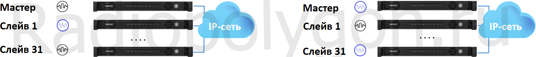 Сеть строится по Master-Slave архитектуре, где Master (Мастер) это ведущий ретранслятор, и Slave (Слейв) - ведомый. В сети всегда будет один мастер и некоторое количество слейвов (до 31 включительно).