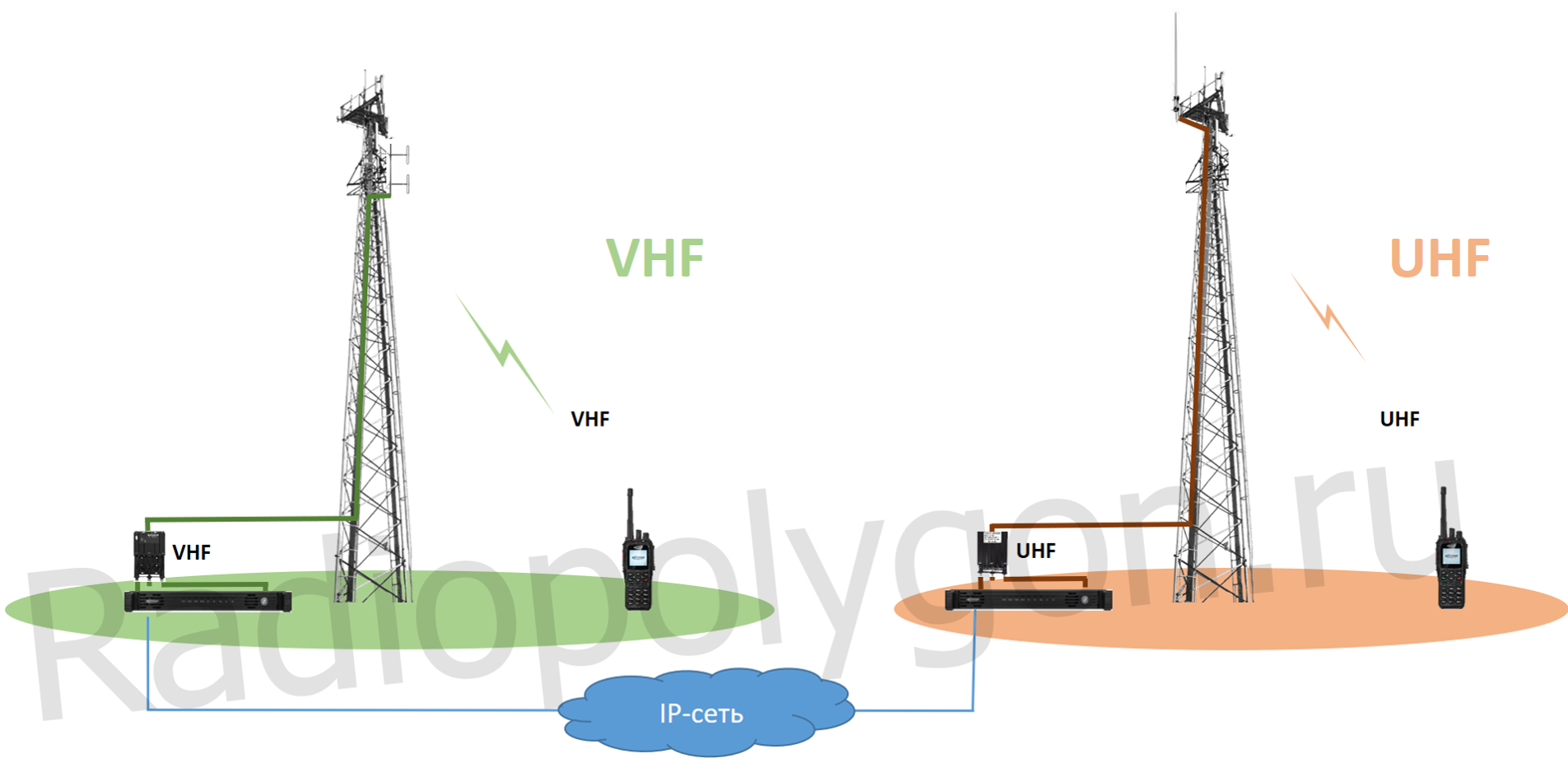 Объединять можно и ретрансляторы разных диапазонов (VHF и UHF). Как в пределах одного сайта: