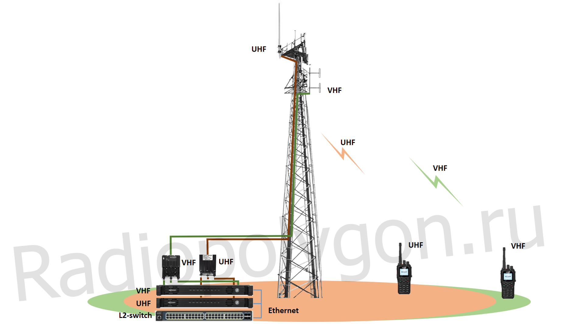 Спустя какое-то время вы упрётесь в то, что радиопокрытия одного ретранслятора вам может стать недостаточным. Причины могут быть разными: где-то остались "мертвые зоны" в виду особенностей рельефа, или руководитель предприятия решил радиофицировать огромный паркинг предприятия (ни о каком пробитии сигнала извне речи и быть не может), или предприятие решило расширить покрытие радиосети,