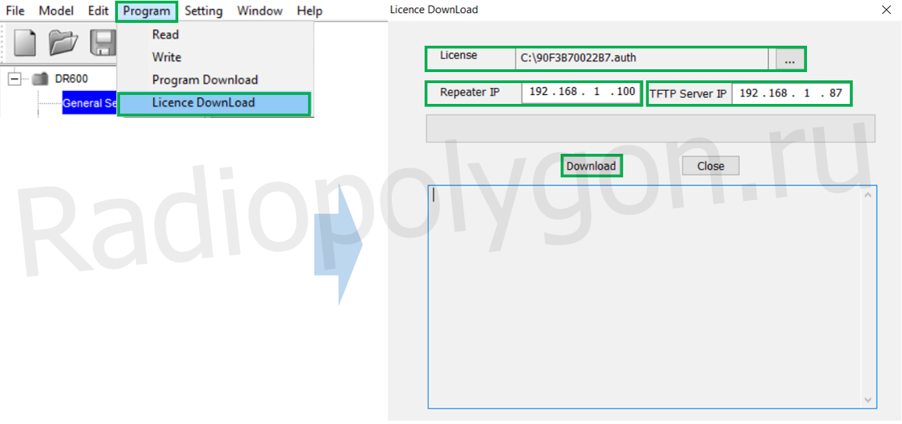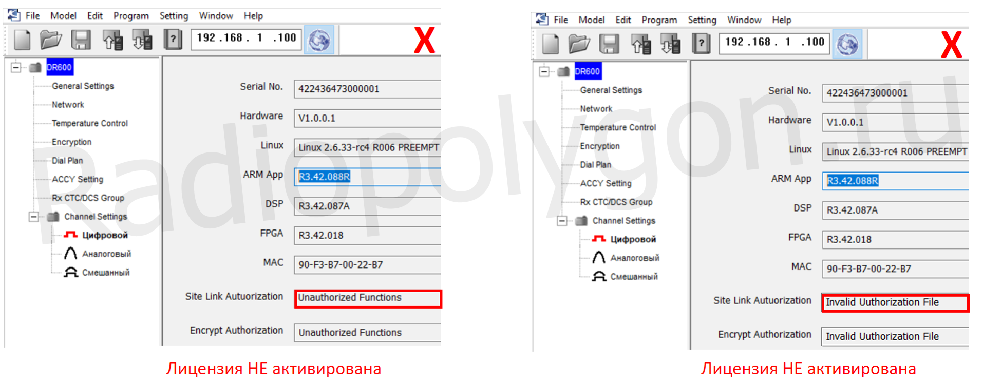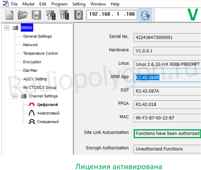 По умолчанию ретрансляторы DR600 не содержат в себе лицензию на IPSC. Поэтому объединить в IP-сеть ретрансляторы "из коробки" у вас не получится. Если вы не первый пользователь ретранслятора или не уверены насчёт статуса лицензии, проверить статус можно следующим образом: считать ретранслятор, перейти в раздел DR600, посмотреть статус в строке Site Link Authorization.